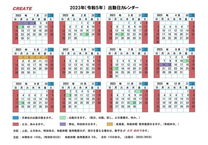 2023年度の弊社出勤日カレンダーをご案内申し上げます。  クリエイト株式会社