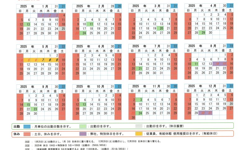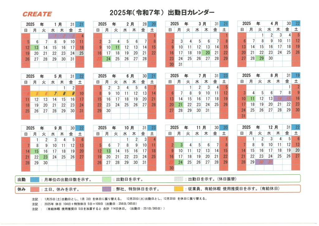 • 2025年度の弊社出勤日カレンダーをご案内申し上げます。  クリエイト株式会社