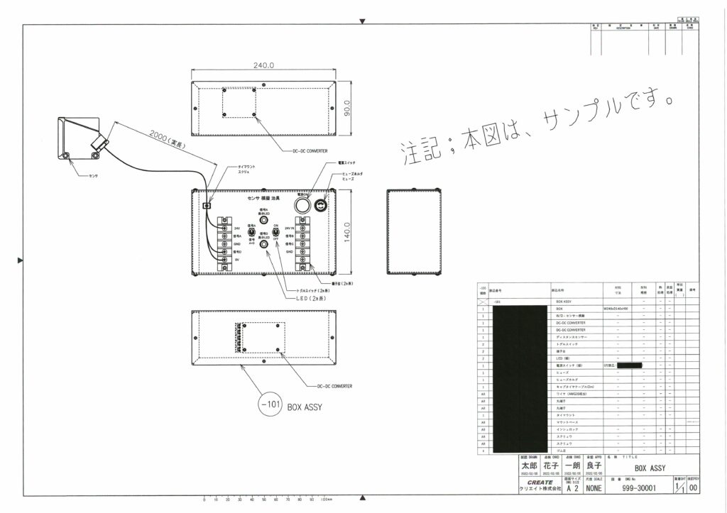 お客様 仕様に従い、アルミ板金、折り曲げボックスの製造図と電気的回路図、配線図を作成し、信号模擬する電子機器組立て製品です。